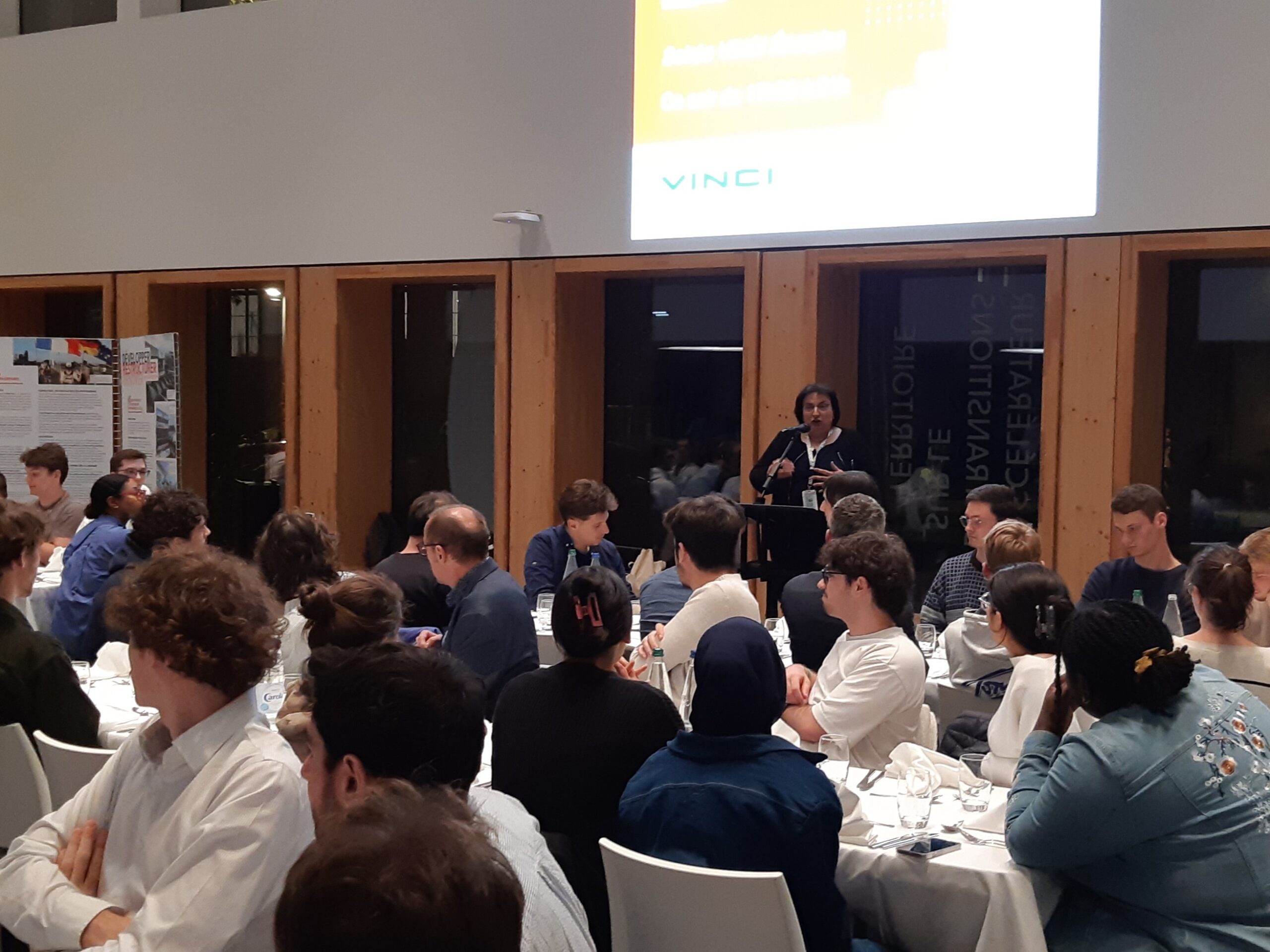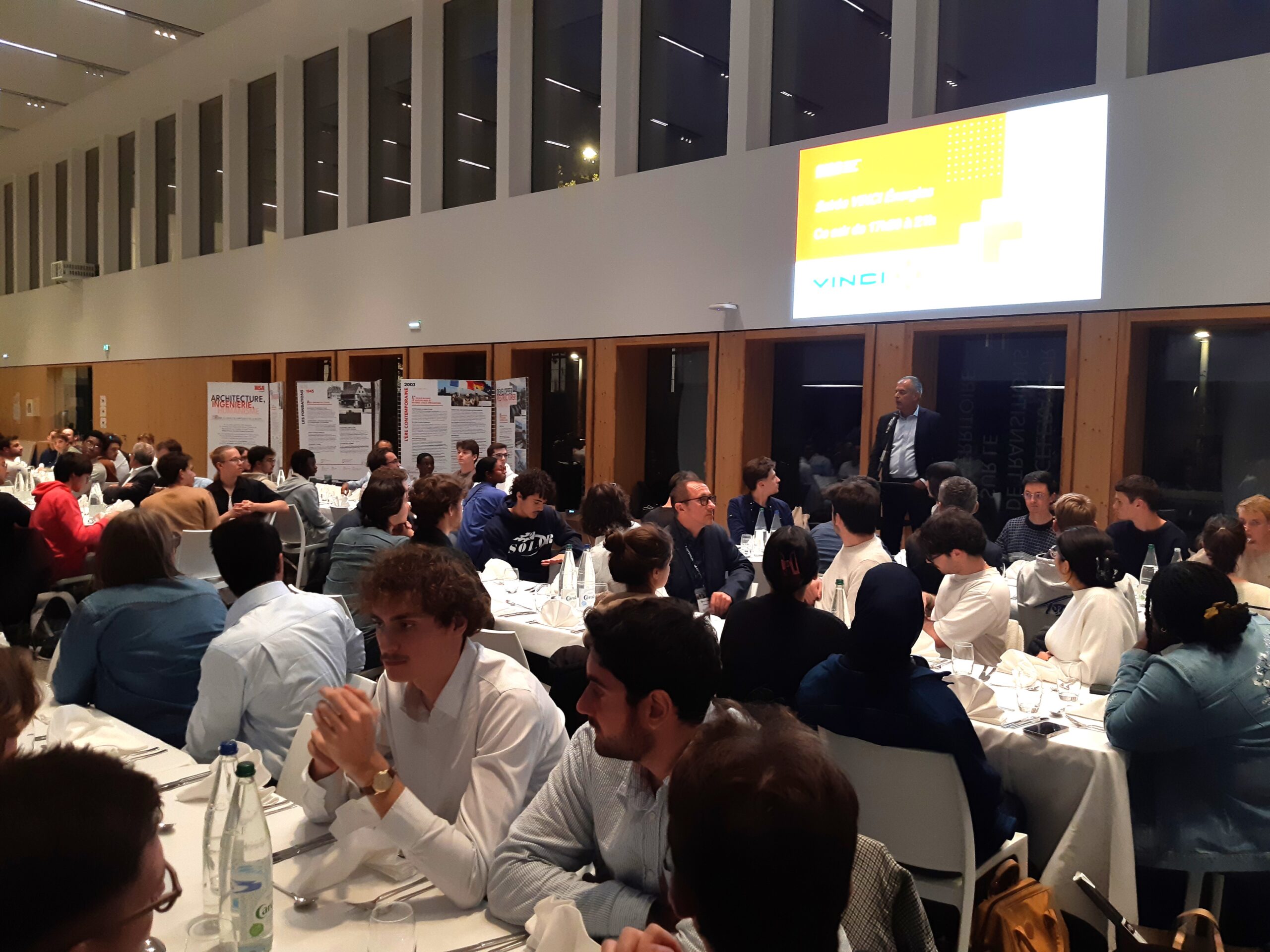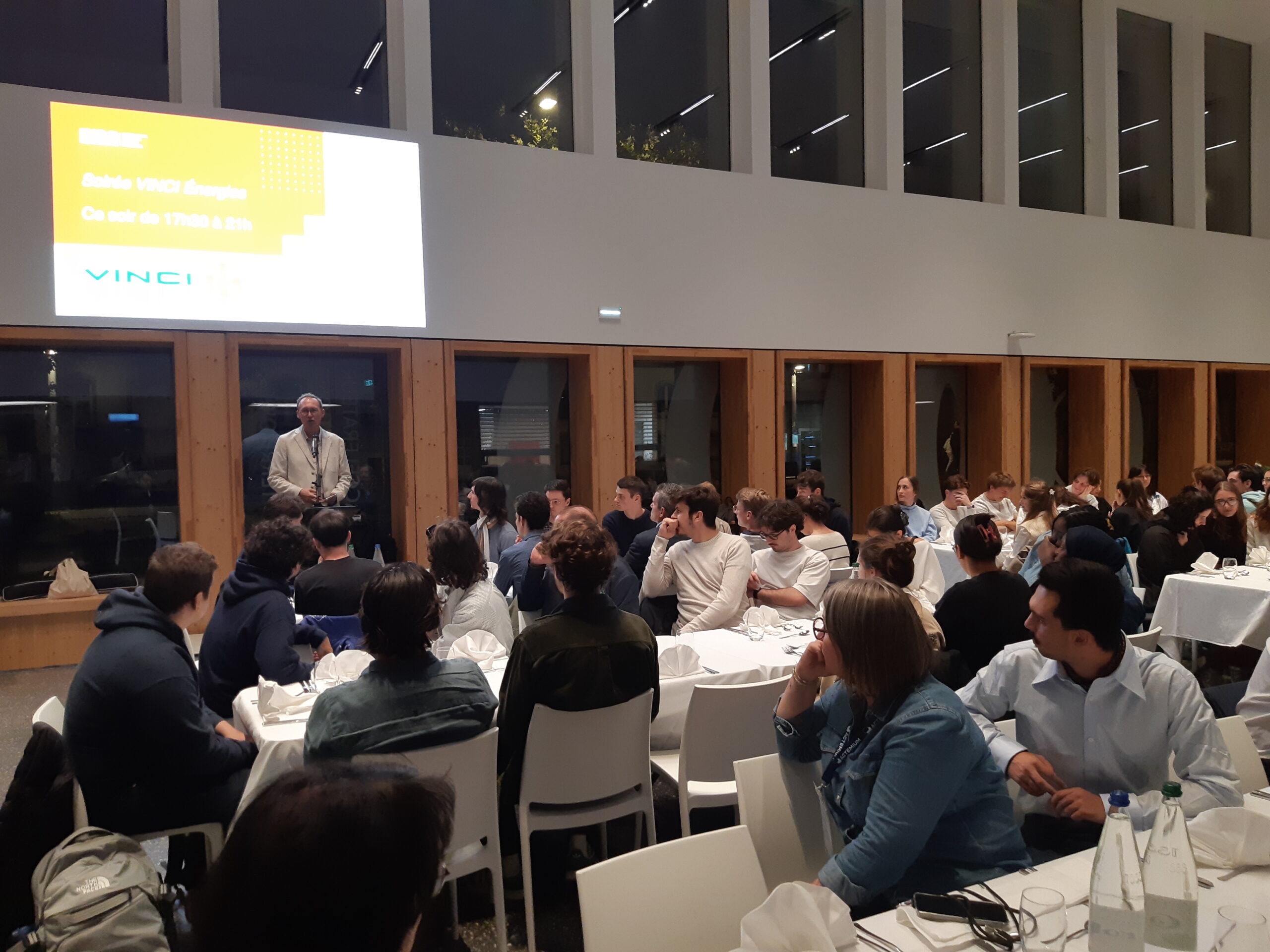 La soirée s’est poursuivie autour d’un apéritif convivial dans l’espace Œuf, propice aux échanges informels entre étudiants et professionnels, puis par un dîner assis dans le hall de l’école. Grâce au système de tables tournantes, les étudiants ont eu l’opportunité d’échanger, à chaque plat, avec de nouveaux interlocuteurs issus des différentes entités de VINCI Énergies : managers, ingénieurs, responsables RH et chefs d’entreprises.